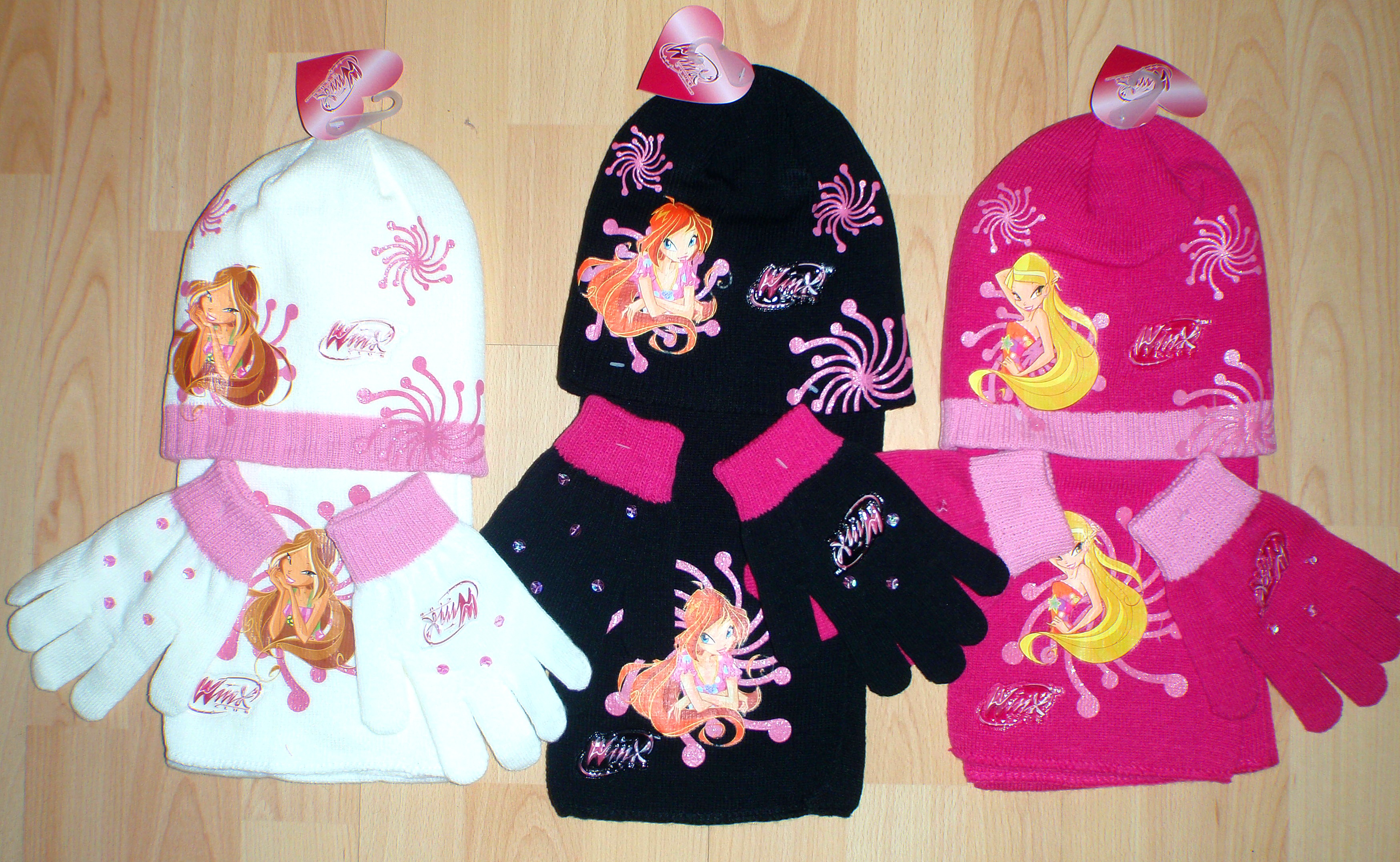 Яркий, мягкий, необычный комплект с шапочкой, перчатками и шарфом Винкс. С изображением фей на шапочке и шарфе. Комплект украшен блестками и рисунком. Производство Турция, состав акрил 100%.