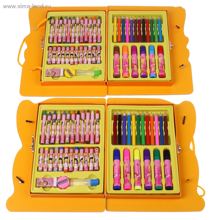 6 фломастеров, 12 цветных карандашей, клей, точилка, ластик, 24 восковых карандаша.